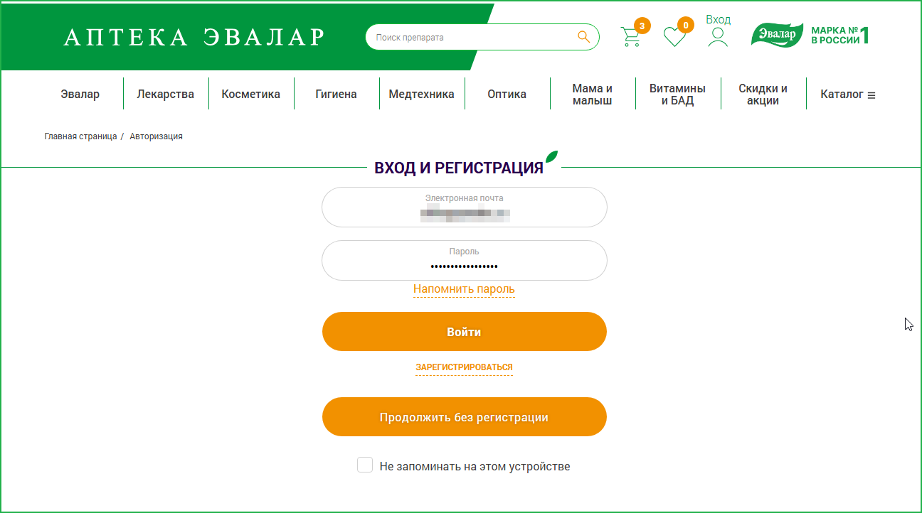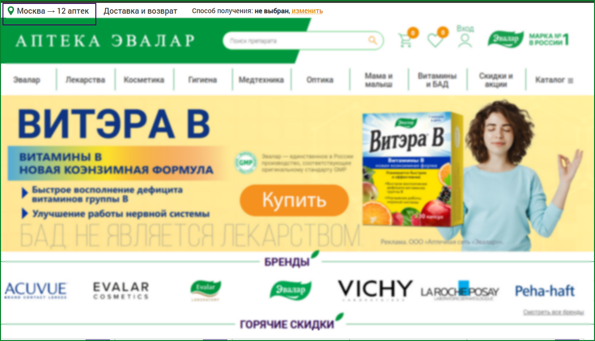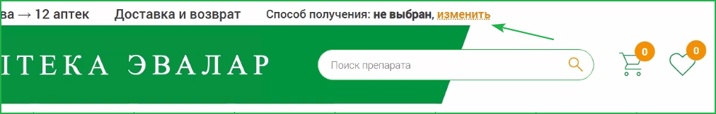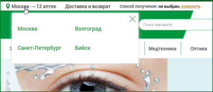 При выборе и сохранении доставки в определенную аптеку, сайт будет отображать ассортимент этой аптеки
