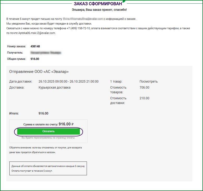 В течение нескольких минут после завершения оформления заказа, вы получите уведомление по SMS и/или электронной почте.