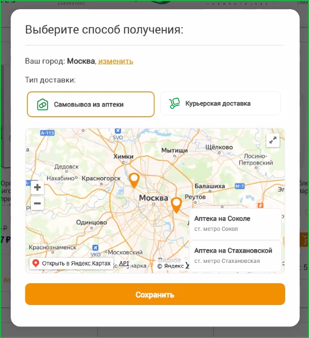 - "Самовывоз из аптеки" - выберите удобную для вас аптеку из списка или на карте;