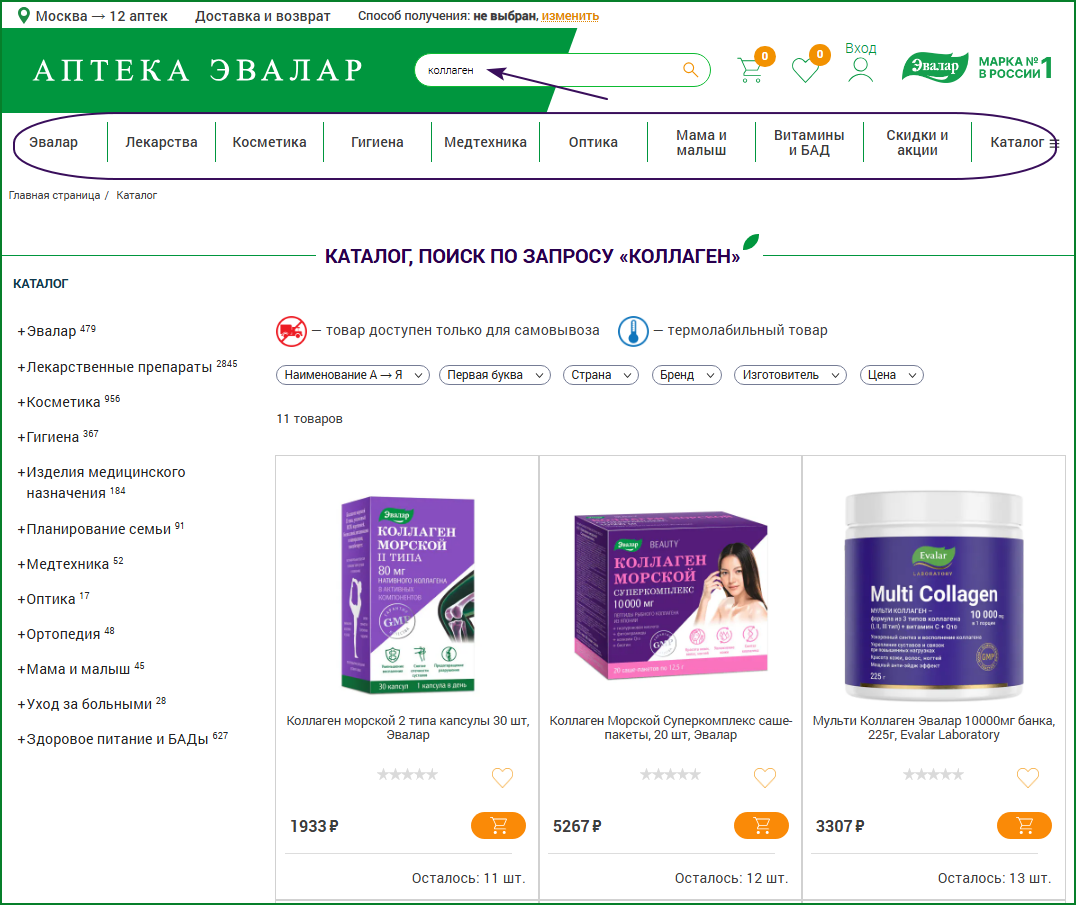 1. Наберите в поисковой строке интересующий вас препарат или воспользуйтесь навигацией в каталоге по категориям