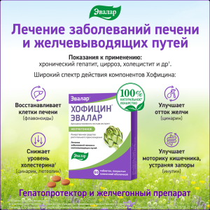 Хофицин от компании «Эвалар» – это 100 % натуральное1 желчегонное лекарственное средство. Он улучшает отток желчи и восстанавливает клетки печени. А еще снижает холестерин2.